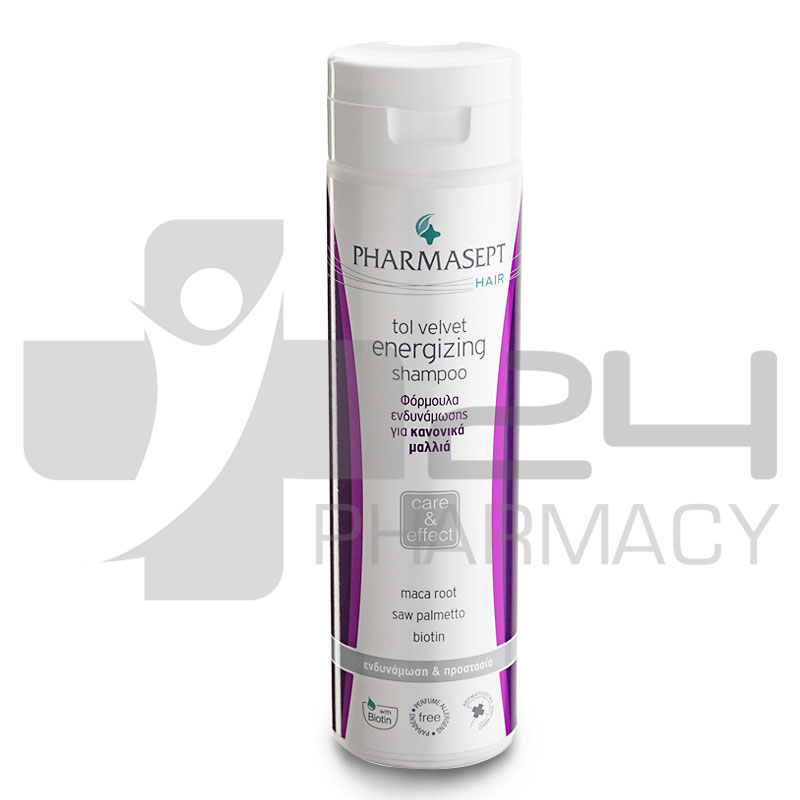 Τα μαλλιά ταλαιπωρούνται καθημερινά από το άγχος, την κακή διατροφή και την ρύπανση. Το Tol Velvet Energizing Shampoo είναι ένα τονωτικό σαμπουάν καθημερινής χρήσης που συνδυάζει εκχυλίσματα Saw Palmetto, ρίζας Maca από τις Περουβιανές Άνδεις και Βιοτίνης. Χάρη σε αυτή την πρωτοποριακή σύνθεση, εξυγιαίνει το τριχωτό της κεφαλής, θρέφει τα μαλλιά από τη ρίζα και ενεργοποιεί την ανάπτυξη της τρίχας έως και 93% (in vitro tests).