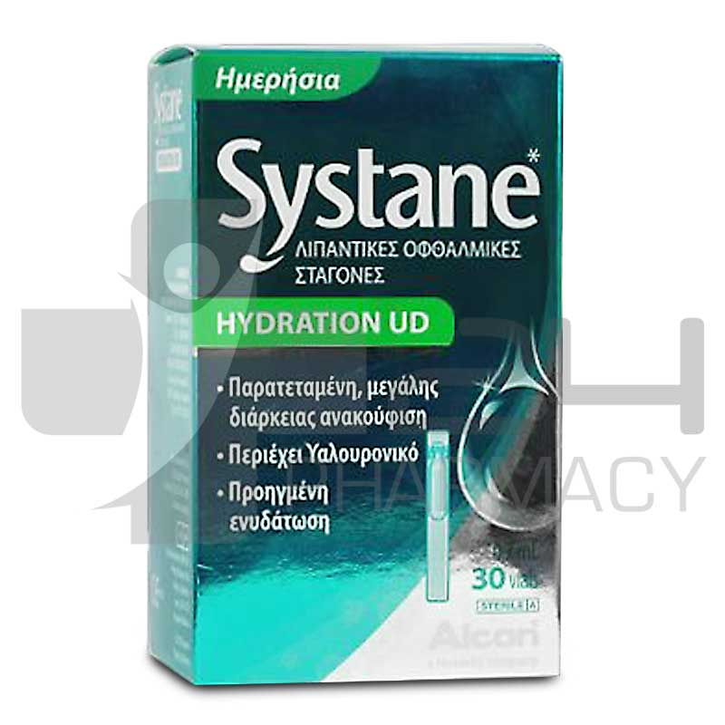 Το Systane Hydration UD λιπαντικές οφθαλμικές σταγόνες δεσμεύει το νερό και έτσι παρέχει μεγαλύτερη ενυδάτωση, λίπανση και παρατεταμένη, μεγάλης διάρκειας ανακούφιση. Επιτρέπει επίσης την αποκατάσταση των κυττάρων που έχουν υποστεί βλάβη στην επιφάνεια του οφθαλμού. Για την προσωρινή ανακούφιση του καύσου και του ερεθισμού που οφείλεται στην ξηρότητα του οφθαλμού. Μπορεί να χρησιμοποιηθεί επίσης για την ενυδάτωση όλων των φακών επαφής σιλικόνης υδρογέλης και των μαλακών (υδρόφιλων) φακών επαφής για ήπιο ερεθισμό, δυσανεξία και θαμπή όραση.