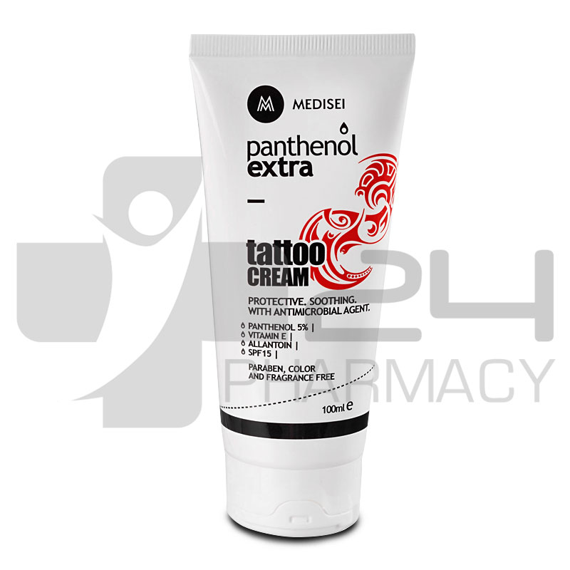 Panthenol Extra Tattoo Cream with 5% Panthenol, Vitamin E, antimicrobial agent and SPF15 protection, creates a waterproof, non-irritating shield over the tattoo area. It helps prevent infections, supports the natural healing process, moisturizes and helps preserve skin elasticity, while protecting the skin and the tattoo colors from the damaging sun rays.