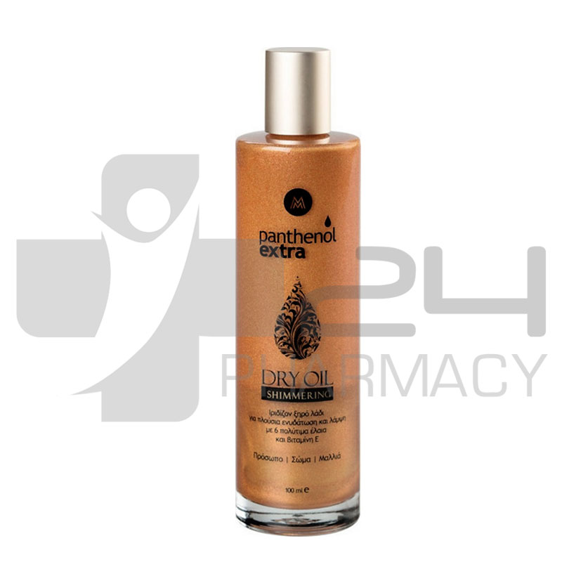 Panthenol Extra Dry Oil Shimmering is a unique blend of 6 precious oils (Olive, Argan, Jojoba, Avocado, Aloe Vera, Apricot) and Vitamin E that strengthens, softens and illuminates skin and hair without leaving a greasy or oily feeling.